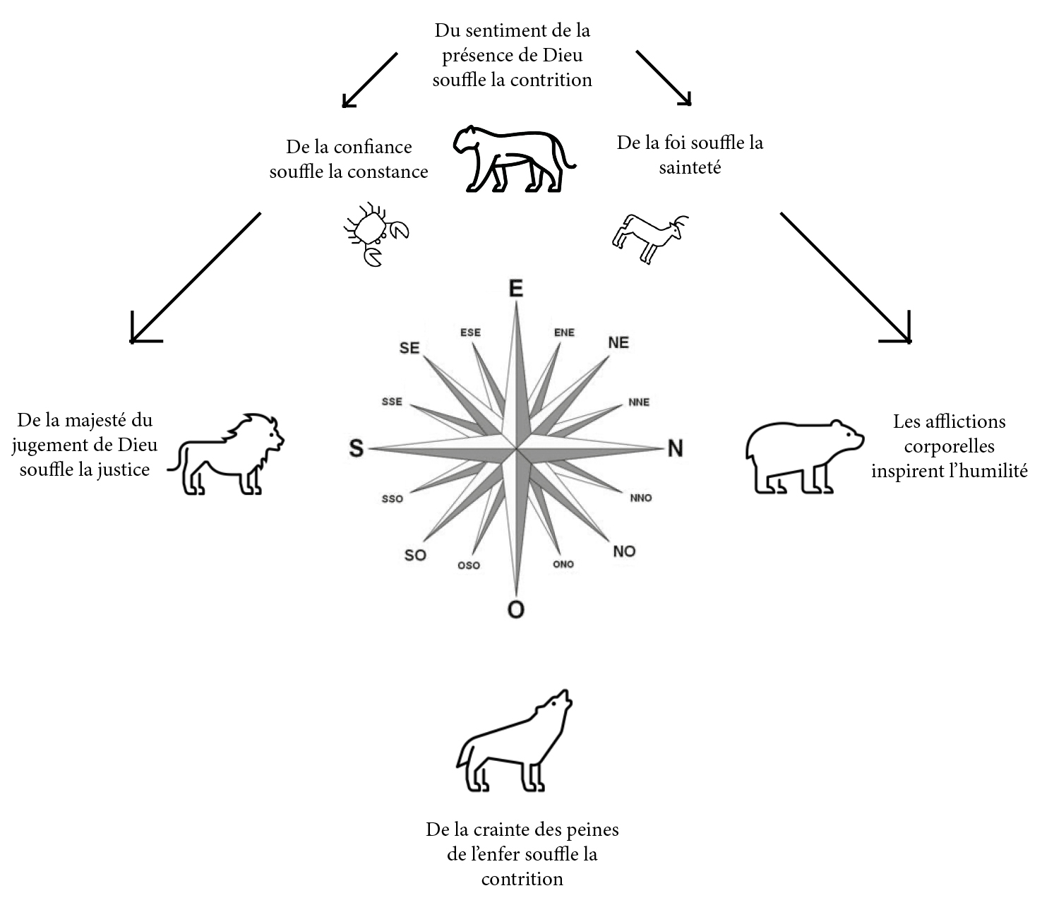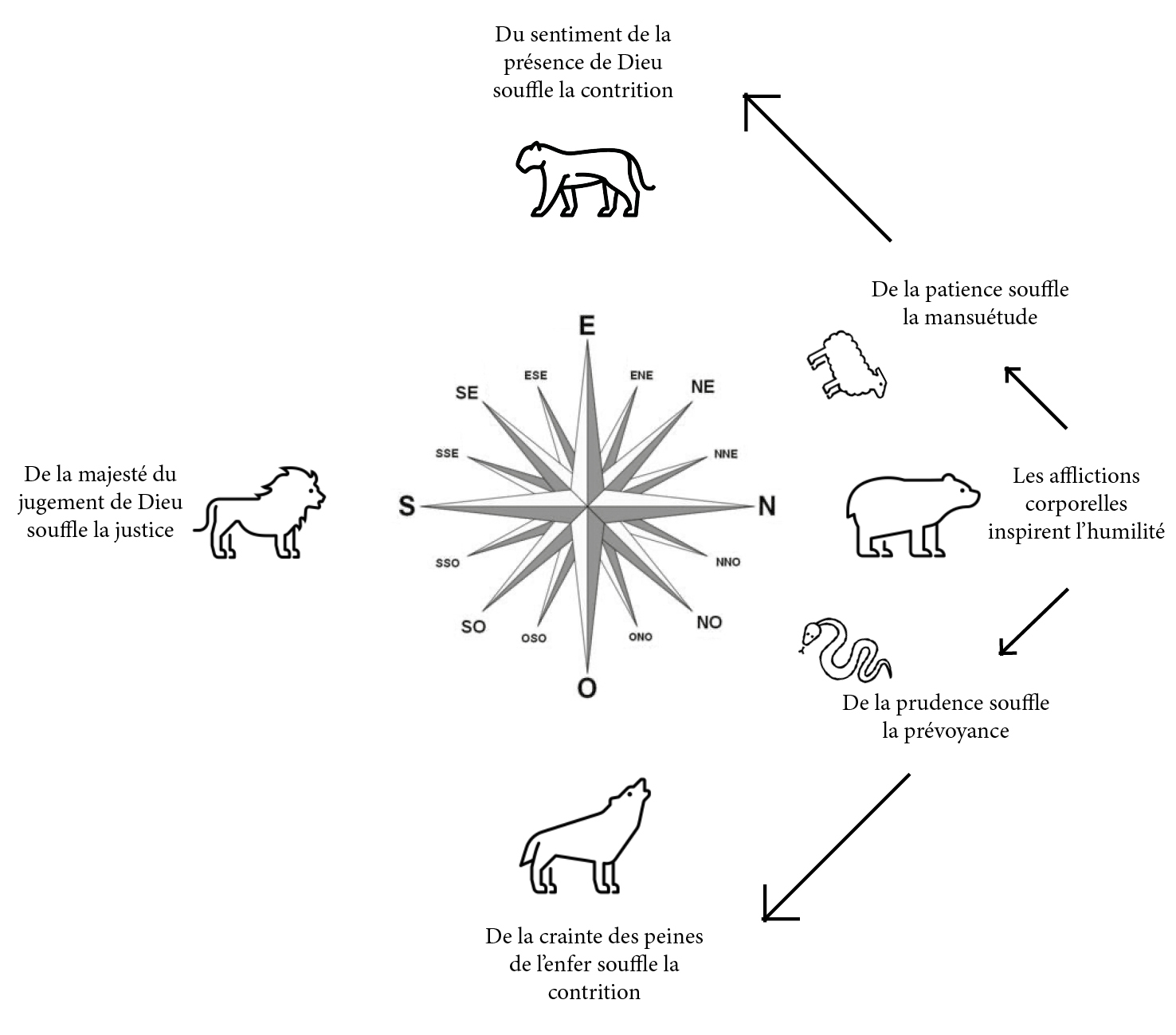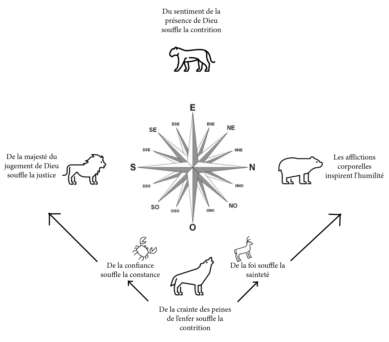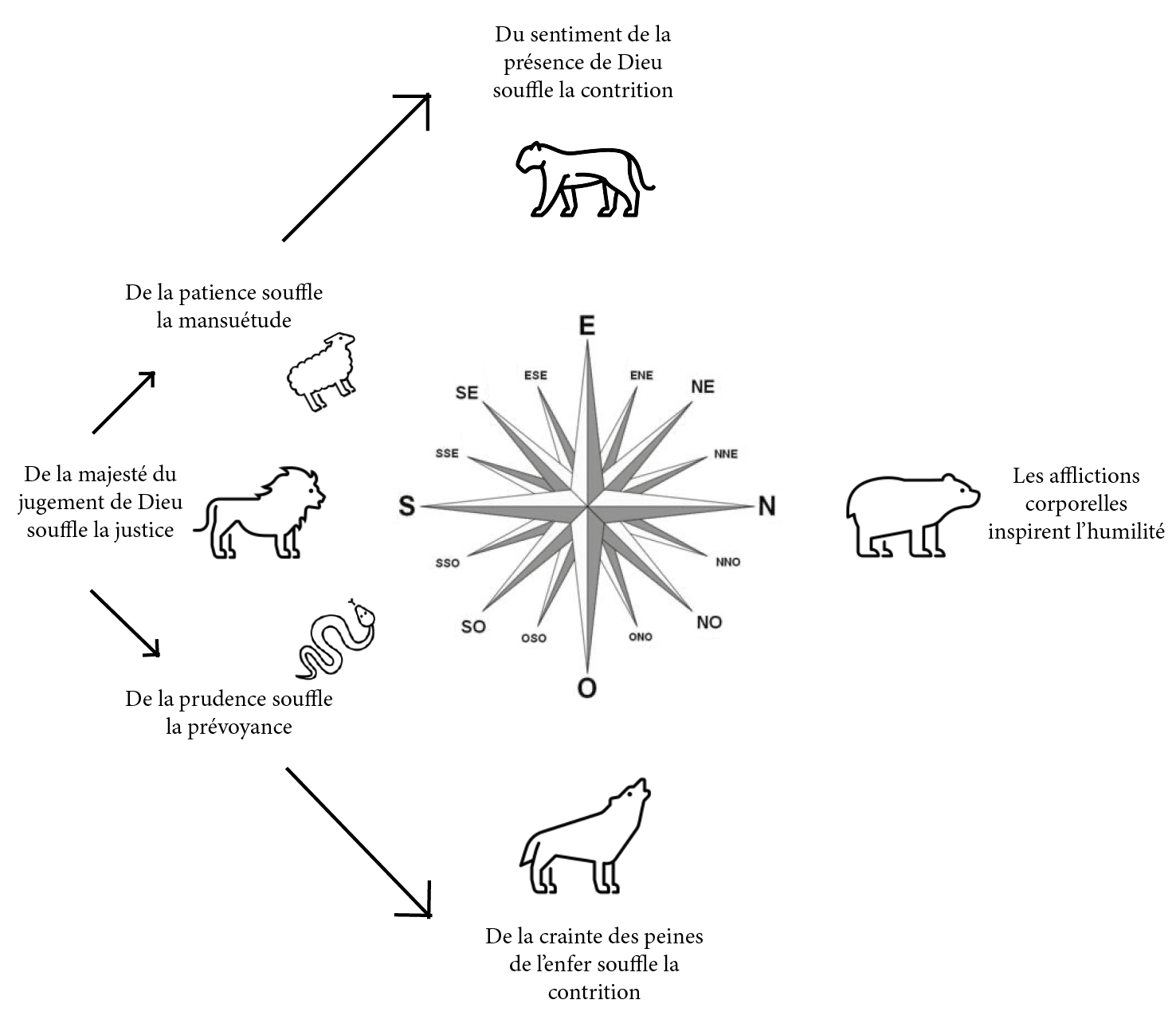 - Souffle Nord Nord-Ouest vers l’Ouest (du serpent vers le loup) : la prudence (serpent) causée par les souffrances corporelles (ours) dirige son souffle (prévoyance) vers la crainte des peines de l’enfer (loup).